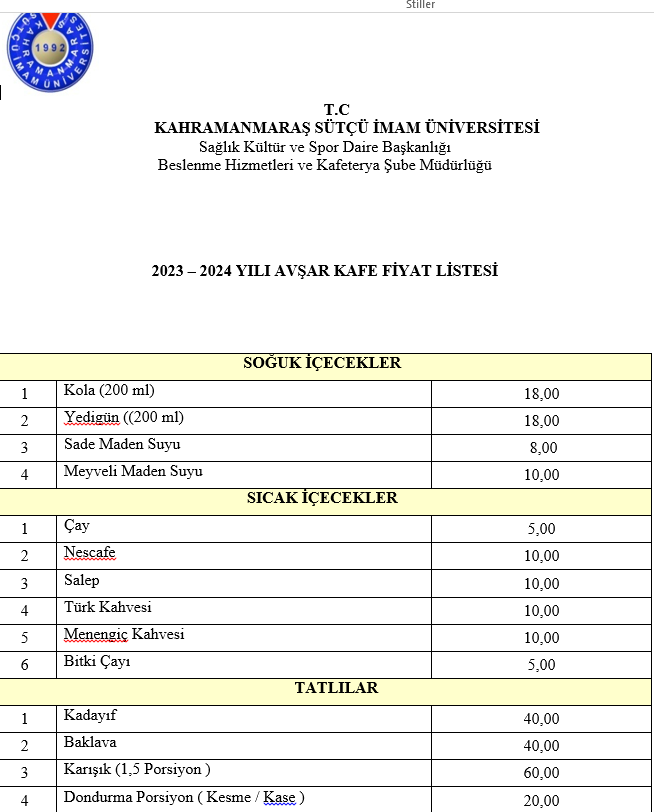 2024 YILI AVŞAR KAFE FİYAT LİSTESİ.